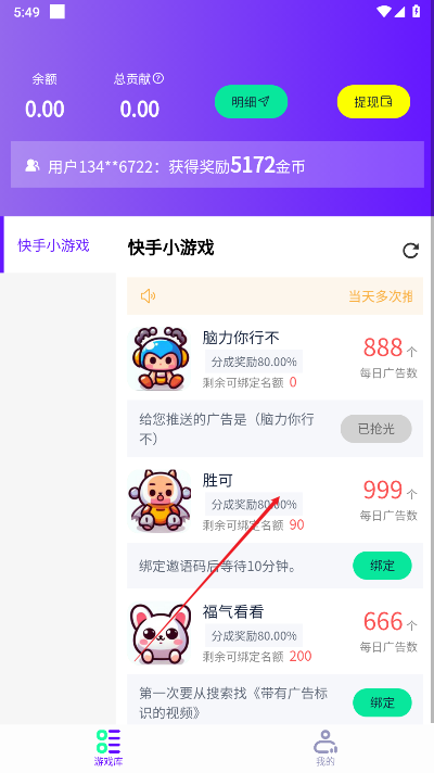 登录APP后,点击“游戏库”,随便找一款游戏,点击“启动”,按弹出的页面先输入要绑定的快手号,再点击“发送”或“搜索”,最后复制自己的邀请码填写到游戏内完成绑定,绑定后关闭快手,等待15分钟后就可以进入小游戏撸广告。