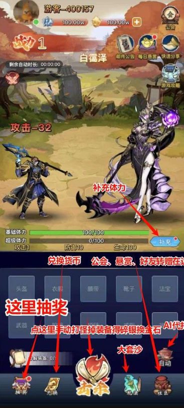 二、战力与体力系统:策略养成,战力提升:穿戴高等级装备(分6品质、10部位,等级上限50),攻击、防御、生命属性直接影响战力,体力管理:分解装备消耗体力,每日0点恢复基础值,或消耗金石购买“超级体力”,提升碎银分解效率。