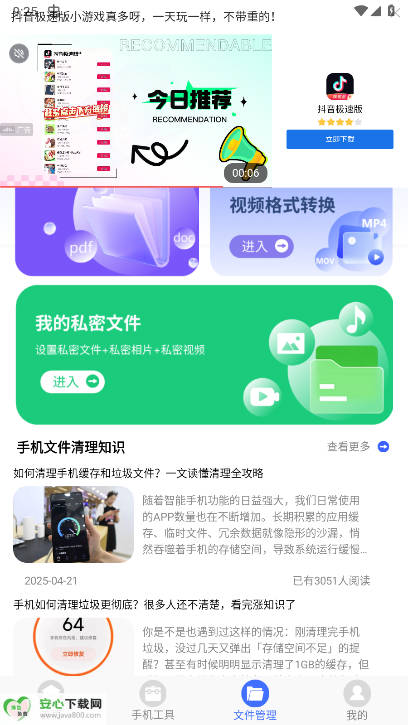 “文件管理闭环” 解决核心痛点:构建从 “安全存储” 到 “高效处理” 再到 “便捷传输” 的文件管理全流程 —— 私密文件加密防护隐私,大文件压缩释放空间,多格式转换解决兼容性问题,跨设备传输简化手机搬家流程。每个功能均直击用户痛点,例如格式转换支持多类型互转,满足办公、娱乐等不同场景的文件处理需求。