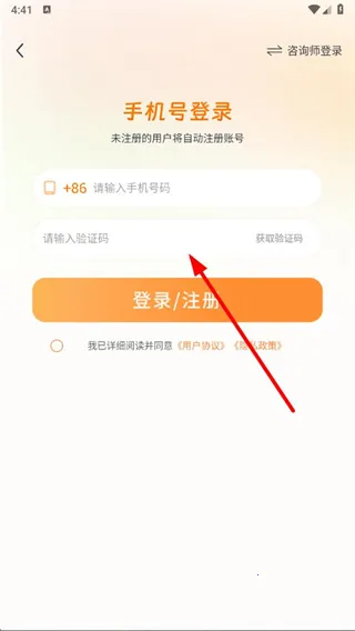 3、在界面输入手机号码,获取验证码,勾选同意用户协议后,点击登录注册按钮,即可账号登录。
