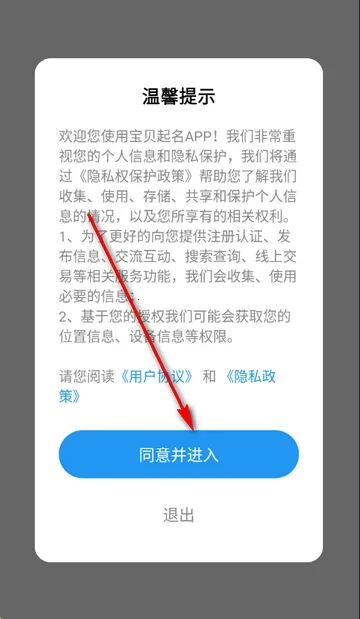 1、打开宝贝起名app,点击同意隐私政策