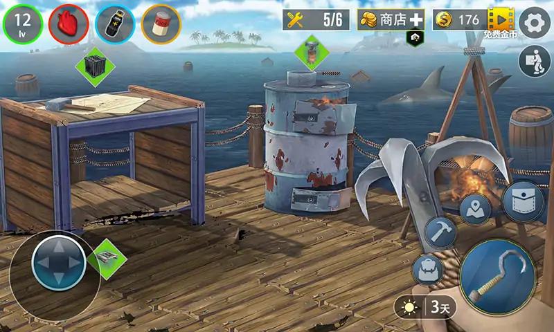 制作与建造: 利用收集到的资源制作各种工具、武器、设备和建筑,例如鱼竿、水净化器、斧头、锤子,以及扩大你的木筏,建造更安全的居住空间。