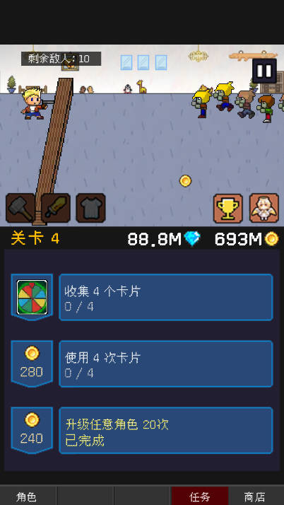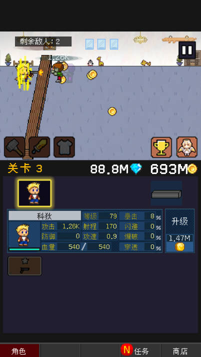 角色有三名,分别对应三种不同武器,外加一个围墙,都是消耗金币单线升级,连每一级所需的数值都相同。数值需求逐渐放大,以此来拖长游戏时间。