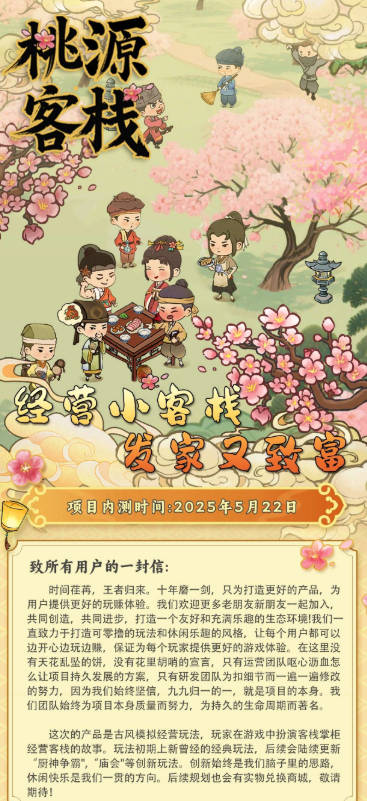 这次的产品是古风模拟经营玩法,玩家在游戏中扮演客栈掌柜经营客栈的故事。玩法初期上新曾经的经典玩法,后续会陆续更新“厨神争霸”,“庙会”等创新玩法。创新始终是我们脑子里的思路,休闲快乐是我们一贯的方向。后续规划也会有实物兑换商城,敬请期待!