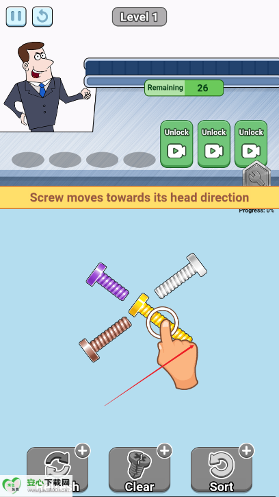 最好的螺丝游戏免广告版(com.zhdls.s123)是一款充满挑战和创意的解谜游戏,玩家将在错综复杂的螺栓堆中展开冒险。游戏的核心任务是将颜色相同的螺栓和螺母配对,逐步清除队列。每完成一次匹配,游戏难度便会逐步提升。