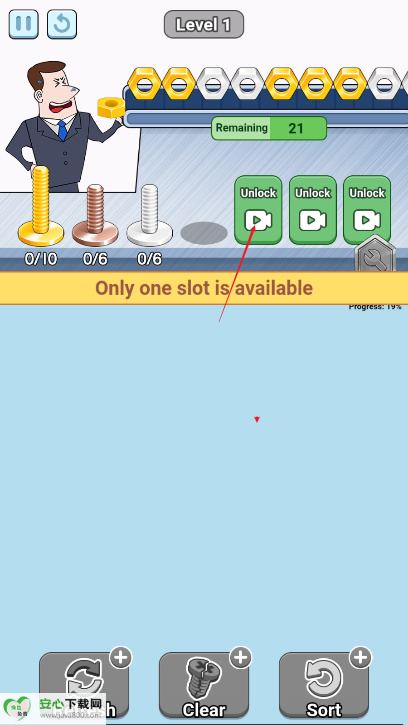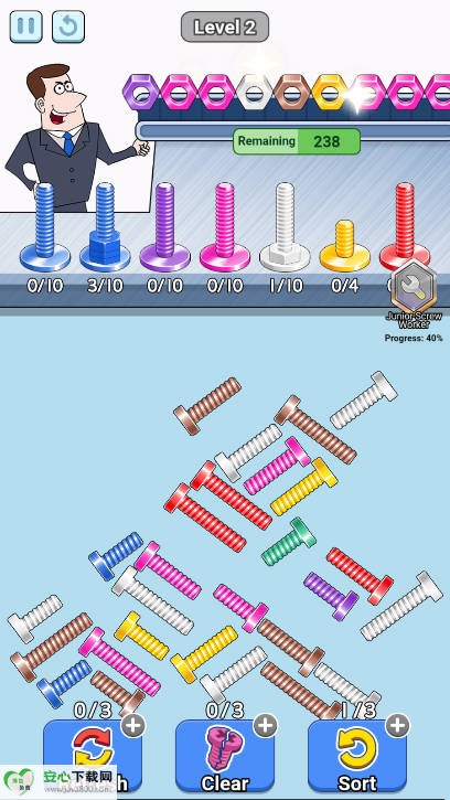 视觉体验有优化空间:虽以“多彩”为特点,但螺栓与螺母的视觉区分度若能进一步提升(如增加细微纹路、不同形状底座等),可减少玩家在快速操作中因颜色相近产生的误判,尤其在后期多色队列场景中,能显著提升游戏体验。