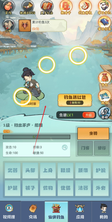 ③装备系统,战力全靠它撑着。在鱼塘就能摸到不同品质的装备,要是低品质的也别扔,拆了能得经验值。装备等级一提上来,战力直接往上飙,后面打BOSS就轻松多了。