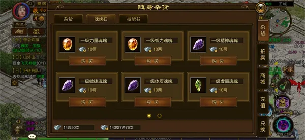 随身商店会出售魂魄石,绑定银两就能购买。根据自己的喜好选择要购买的魂魄石,魂魄石的合成基数为5个,根据你预计达到的魂魄石等级,以及当前的魂魄石剩余数量来考虑具体的购买数量哦。