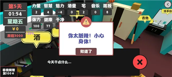 11、当你的干净分降低到负数的时候,系统会提醒你注意身体,记得及时洗漱保持身体健康才能继续赚大钱哦。