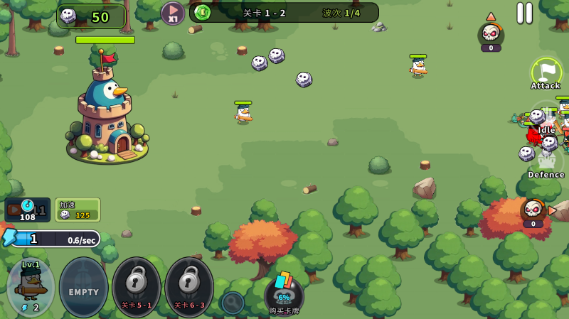 - 收集行动力,生产鸭子士兵来击败怪物!