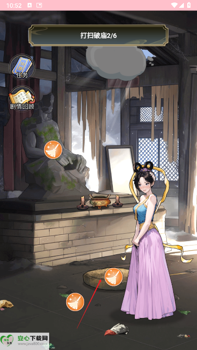 第三幕:玩家需要依次点击破庙里的【打扫图标】,帮助男主(戒色)完成打扫任务。
